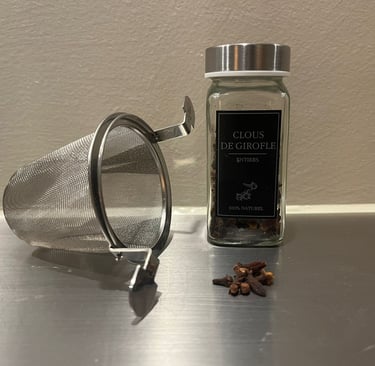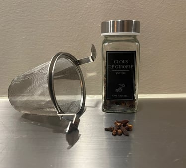 Intérêt : En infusion, utilisé ponctuellement, il aide à calmer les douleurs aiguës. Je met 5 clous de girofle dans un verre et je verse de l'eau chaude (90°C) dessus. Je laisse infuser 6 minutes puis je retire les clous et je le bois tiède le soir avant d'aller me coucher.